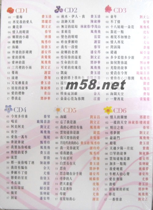 好歌102 70-80's國語流行金曲(m58.net) [好歌102] 70~80's國語流行金曲6CD 一曲難忘 陪你度過浪漫70~80年代最具代表性的經典歌典,位位天皇巨星轟動再現! 劉文正、費玉清、鳳飛飛、陳淑樺、齊豫、黃鶯鶯、費翔、潘安邦、銀霞、岳雷、鄧妙華、 甄秀珍、翁倩玉、尤雅、謝雷等巨星成名曲完整珍藏。收錄好歌102首經典金曲,包括: 一翦梅/費玉清、蘭花草/劉文正、再見我的愛人/鄧麗君、浪跡天涯/陳淑樺、今宵多珍重/蔡琴、 靠近一點/沈雁、喝釆/歐陽菲菲、海鷗/翁倩玉、外婆的彭湖灣/潘安邦、海闊天空/費翔、 恰似你的溫柔/費翔、珍重道別離/余天、我的心里沒有他/鳳飛飛、愛在飛揚/尤雅、 昨夜夢醒時/謝雷、…等一套6CD。 特別收錄: 一樣的天空 – 林淑蓉、李戊山 、鄉間的小路 – 齊豫、不了情 -蔡琴 特別推介: 橄欖樹 - 甄秀珍 、無言的結局 - 林淑蓉、樓湘靈、再見我的愛人 -鄧麗君