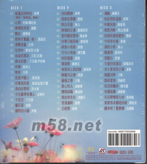 DISC 1 01. 被遺忘的時光 -蔡琴(電影[無間道]插曲) 02. 心雨 -毛寧/楊鈺瑩 03. 彎彎的月亮 -劉歡 04. 舞女 -韓寶儀 05. 愛拼才會贏(閩) -葉啟田 06. 濤聲依舊 -毛寧 07. 在雨中 -劉家昌/尤雅 08. 血染的風(fēng)采 -王虹/常寬 09. 纖夫的愛 -于文華/尹相杰 10. 祈禱 -翁倩玉 11. 晚秋 -毛寧 12. 我是中國人 -劉家昌 13. 珍重我的愛 -劉家昌/劉艾靈 14. 真的好想你 -周冰倩 15. 今生難得有情人 -梁雁玲 16. 千百次 -千百惠 17. 蘭花草 -銀霞 18. 鄉(xiāng)間的小路 -齊豫 DISC 2 01. 你的眼神 -蔡琴 02. 我家在那里 -甄妮 03. 明日天涯 -青山 04. 熱情的沙漠 -歐陽菲菲 05. 愛你變成害你 -潘迪華 06. 往事只能回味 -劉家昌 07. 綠島小夜曲 -紫薇 08. 月光小夜曲 -陳芬蘭 09. 秋詩篇篇 -銀霞 10. 珊瑚戀 -翁倩玉 11. 春風(fēng)吻上我的臉 -鳳飛飛 12. 梭羅河之戀 -美黛 13. 薔薇之戀 -尤雅 14. 負(fù)心的人 -姚蘇蓉 15. 煙雨斜陽 -陳淑樺 16. 我在你左右 -湯蘭花 17. 苦酒滿杯 -謝雷 18. 王昭君 -楊燕 DISC 3 01. 海鷗 -翁倩玉 02. 恰似你的溫柔 -蔡琴 03. 中華民族 -劉家昌 04. 相思河畔 -青山/美黛 05. 玫瑰玫瑰我愛你 -甄妮 06. 今宵多珍重 -紫薇 07. 淚的小雨 -青山 08. 楓葉情 -鳳飛飛 09. 意難忘 -美黛 10. 可愛的玫瑰花 -歐陽菲菲 11. 多少柔情多少淚 -謝雷 12. 梭羅河畔 -尤雅 13. 誰來愛我 -鄧麗君 14. 我沒有騙你 -陳芬蘭 15. 你儂我儂 -姚蘇蓉 16. 月兒彎彎照九州 -張琍敏 17. 家家有本難念的經(jīng) -陳盈潔 18. 醒來吧!雷夢娜 -包娜娜
