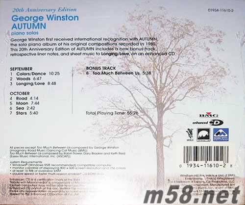 AUTUMN 20周年紀(jì)念版 秋天鋼琴獨奏 美版(m58.net) 喬治·溫斯頓(George Winston)是美國密西根州的作曲家兼鋼琴家。其柔美優(yōu)雅極富文人氣息清新獨特的曲風(fēng),使他成為新世紀(jì)(New Age)音樂界中極具代表性的卓越人物。 喬治.溫斯頓的曲目是鋼琴美學(xué)史上最純凈逸品之大成,他的音樂舒俊流暢、旋律優(yōu)美,極具可聽性。是新世代音樂中具有代表性的卓越人物。他因其優(yōu)異的音樂才華而多次獲得格萊美大獎和格萊美聯(lián)社大獎提名的極高榮譽,每年都因樂迷們的強(qiáng)烈要求而進(jìn)行100 多場全球巡演,受到世界各地觀眾們的熱忱歡迎。他成長的蒙他那州的季節(jié)變化景象,豐富了他在創(chuàng)作時的靈魂。