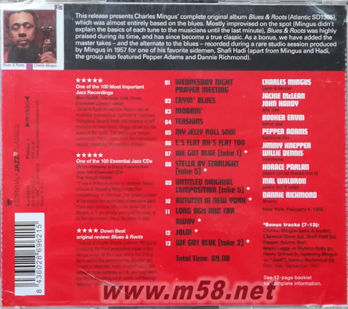 Blues & Roots 爵士貝斯手 (爵士大師五星系列)(m58.net) 數(shù)字修復的這張爵士樂專輯很棒。 包含Charles Mingus的完整原創(chuàng)專輯Blues&Roots,藍調(diào)作品。 大多是在現(xiàn)場即興創(chuàng)作(Blues&Roots在這段時間內(nèi)受到高度贊揚,并且從此成為一個真正的經(jīng)典。 作為獎勵,我們在1957年Mingus制作的一個罕見的演播室會議期間錄制了藍調(diào)的主奏和替補曲目,以供他最喜歡的副手之一Shafi Hadi設計,其中還包括Pepper Adams和Dannie Richmond。 基本爵士經(jīng)典。Digitally remastered and expanded edition of this album from the Jazz great. Contains Charles Mingus' complete original album Blues & Roots, which was almost entirely based on the Blues. Mostly improvised on the spot (Mingus didn't explain the basics of each tune to the musicians until the last minute), Blues & Roots was highly praised during it's time, and has since become a true classic. As a bonus, we have added the master takes and the alternate to the Blues recorded during a rare studio session produced by Mingus in 1957 for one of his favorite sidemen, Shafi Hadi also featuring Pepper Adams and Dannie Richmond. Essential Jazz Classics.