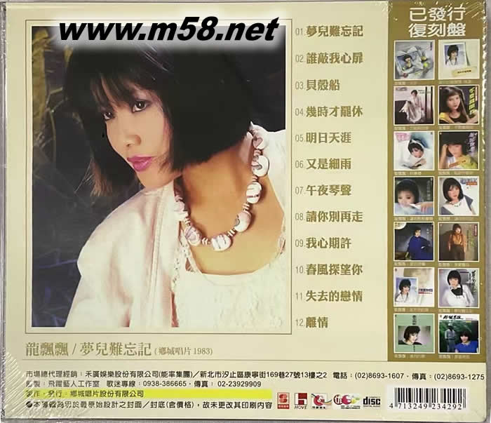 價格為估,以實到貨為準! 夢兒難忘記 原色系列(m58.net) 龍腔雅韻的歌聲 有你我共同的聽歌回憶 飄逸灑脫的嗓音 是市場公認的暢銷歌后 飄洋過海的傳奇 狂掃全球華人地區歌迷 龍飄飄 不要離開我專輯 發燒音質再造話題