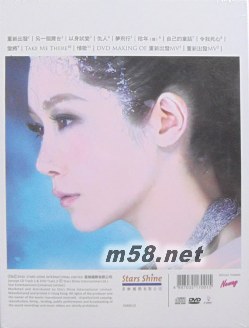CD 01. 重新出發(fā) 02. 另一個(gè)舞臺(tái) 03. 以身試愛(ài) 04. 仇人 05. 夢(mèng)飛行 06. 拾年 (國(guó)) 07. 自己的童話(huà) 08. 令我死心 09. 愛(ài)將 10. Take Me There 11. 情歌 DVD 01. Making of 重新出發(fā) 02. 重新出發(fā) MV