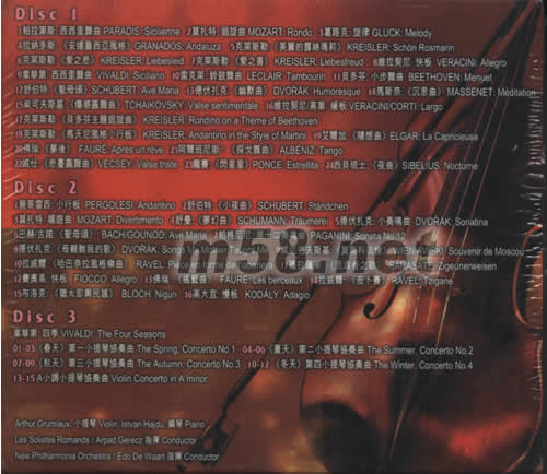 Disc 1 01. 帕拉第斯:西西里舞曲 PARADIS:Sicilienne 02. 莫扎特:回旋曲 MOZART:Rondo 03. 葛路克:旋律 GLUCK:Melody 04. 拉納多斯:《安達魯西亞風格》GRANADOS:Andaluza 05. 克萊斯勒:《美麗的露絲瑪莉》KREISLER:Schon Rosmarin 06. 克萊斯勒:《愛之悲》KREISLER:Liebesleid 07. 克萊斯勒:《愛之喜》KREISLER:Liebesfreud 08. 維拉契尼:快板 VERACINI:Allegro 09. 韋華第:西西里舞曲 VIVALDI:Siciliano 10. 雷克萊:鈴鼓舞曲 LECLAIR:Tambourin 11. 貝多芬:小步舞曲 BEETHOVEN:Menuet 12. 舒伯特:《圣母頌》SCHUBERT:Ave Maria 13. 德伏扎克:《幽默曲》DVORAK:Humoresque 14. 馬斯奈:《沉思曲》MASSENET:Meditation 15. 柴可夫斯基:《傷感圓舞曲》TCHAIKOVSKY:Valse sentimentale 16. 維拉契尼/高第:緩板 VERACINI/CORTI:Largo 17. 克萊斯勒:《貝多芬主題回旋曲》KREISLER:Rondino on a Theme of Beethoven 18. 克萊斯勒:《馬天尼風格小行板》KREISLER:Andantino in the Style of Martini 19. 艾爾加:《隨想曲》ELGAR:La Capricieuse 20. 佛瑞:《夢后》FAURE:Apres un reve 21. 阿爾班尼斯:《探戈舞曲》ALBENIZ:Tango 22. 威仕:《悲憂圓舞曲》VECSEY:Valse triste 23. 龐賽:《閃星星》PONCE:Estrellita 24. 西貝琉士:《夜曲》SIBELIUS:Nocturne Disc 2 01. 裴哥雷西:小行板 PERGOLESI:Andantino 02. 舒伯特:《小夜曲》SCHUBERT:Standchen 03. 莫扎特:嬉游曲 MOZART:Divertimento 04. 舒曼:《夢幻曲》SCHUMANN:Traumerei 05. 德伏扎克:小奏鳴曲 DVORAK:Sonatina 06. 巴赫/古諾:《圣母頌》BACH/GOUNOD:Ave Maria 07. 帕格尼尼:第十二奏鳴曲 PAGANINI:Sonata No.12 08. 德伏扎克:《母親教我的歌》DVORAK:Songs My Mother Taught Me 09. 威尼名夫斯基:《莫斯科回憶》WIENIAWSKI:Souvenir de Moscou 10. 拉威爾:《哈巴奈拉風格樂曲》RAVEL:Piece en forme de habanera 11. 薩拉薩蒂:《流浪者之歌》SARASATE:Zigeunerweisen 12. 費奧高:快板 FIOCCO:Allegro 13. 佛瑞:《搖籃曲》FAURE:Les berceaux 14. 拉威爾:《吉卜賽》RAVEL:Tzigane 15. 布洛克:《猶太即興民謠》BLOCH:Nigun 16. 高大宜:慢板 KODALY:Adagio Disc 3 韋華第:四季 VIVALDI:The Four Seasons 01-03. 《春天》第一小提琴協奏曲 The Spring,Concerto No.1 04-06. 《夏天》第二小提琴協奏曲 The Summer,Concerto No.2 07-09. 《秋天》第三小提琴協奏曲 The Autumn,Concerto No.3 10-12. 《冬天》第四小提琴協奏曲 The Winter,Concerto No.4 13-15. A小調小提琴協奏曲 Violin Concerto in A minor