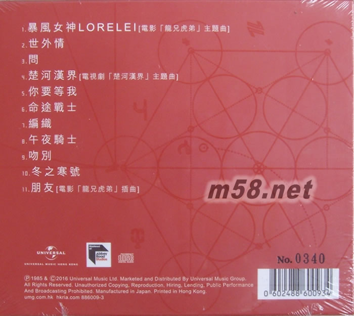 暴風女神LORELEI [電影「龍兄虎弟」主題曲] 2.世外情 3.問 4.楚河漢界 [電視劇「楚河漢界」主題曲] 5.你要等我 6.命途戰士 7.編織 午夜騎士 9.吻別 10.冬之寒號 11.朋友 [電影「龍兄虎弟」插曲]