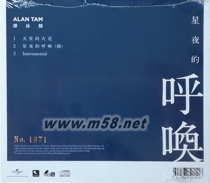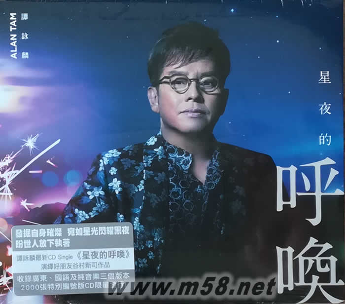 Single星夜的呼喚(限量2000套)(m58.net) 演繹好朋友谷村新司作品 發掘自身璀燦 宛如星光閃耀黑夜.盼世人放下執著 環球唱片2018年「特別企劃」 限量生產2000張5吋CD Single,每一張均附有「獨立編號」 5-inch Single Limited edition (0001 – 2000) 收錄廣東、國語及純音樂 三個版本