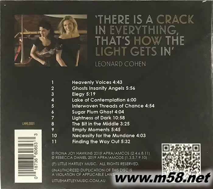 黑暗之光 LIGHTNESS OF DARK 鋼琴與小提琴(m58.net) 萬物都有裂縫,那是光照進來的契機。(There is a crack in everything.That's how the light gets in.)──加拿大詩人歌手李歐納‧柯恩 費歐娜在最新專輯「黑暗之光」(The Lightness of Dark)帶來了不同以往的音樂風格,由鋼琴(費歐娜)、小提琴(麗貝卡·丹尼爾)、弦樂四重奏(Kanimbla 四重奏)和人聲錄製,描繪了悲傷和經過治癒後重現光明的過程,音樂有悲傷的、強烈的、深情的、快樂的情感。 第一首 “Heavenly Voices”改編Pink Floyd的作品,人聲、鋼琴、四重奏的結合帶來淒美引人注目的開場白,第二首 “Ghosts Insanity Angels”是專輯裡唯一的鋼琴獨奏 ,聽起來激情又優雅,“Lightness of Dark”是專輯的同名曲子,結合所有樂器演奏,所有參與的藝術家都為這張質感豐富的作品傾注了全部精力。 費歐娜以浪漫、旋律優美的歌曲和豐富的編曲而聞名,與小提琴家麗貝卡·丹尼爾首次合作錄音共同創作,除了擅長的新世紀音樂,一些曲子也有古典音樂的風格,整張專輯精心錄製,極其注重製作細節,這是完全可以沉浸在其中的音樂,邀請聽者在悲傷中找到美,積極前行,別讓一時的挫敗擊垮自己!是費歐娜令人耳目一新也是一張出色而有趣的專輯。
