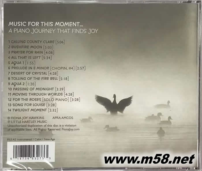 價格為估,以實到貨為準! 穿越世界 MOVING THROUGH WORLDS(m58.net) 榮獲多項鋼琴演奏大獎的New Age作曲家費歐娜花費三年制作,再次與葛萊美獎制作人Will Ackerman合作,最新專輯包含土地、水、火、氣候變化和靈魂等主題。14 首曲目以鋼琴獨奏為主,有些是小提琴或大提琴的二重奏,有些是更多樂器的伴奏。第一首“Calling County Clare”是一首輕鬆活潑的曲目,生動的愛爾蘭口哨與 Fiona 的鋼琴和無言的歌聲、Ackerman 的原聲吉他和 Eaton 的手風琴形成了美妙的音樂。2019年澳大利亞各地發生異常強烈的叢林大火,在這張專輯中,“Bushfire Moon”、“Prayer For Rain”、“Tolling of the Fire Bell”、“All That Is Left”,都在探討這個可怕的時刻,表達令人惋惜的感動情懷,并將這四首作品推向市場,為消防員和野生動物救援募集資金。專輯主打歌“Moving Through Worlds”是鋼琴、小提琴和大提琴的三重奏,充滿了優雅和熱情的情感,講述了一個充滿希望的故事。這張專輯的驚喜還有 Fiona 對蕭邦 E 小調前奏曲 的可愛編曲,也收錄了在 12 歲的時候為她祖母的葬禮創作的鋼琴獨奏曲“For the Roses”,整張專輯穿越多種情緒充滿感情,讓我們享受了豐富的鋼琴之旅,不可錯過!
