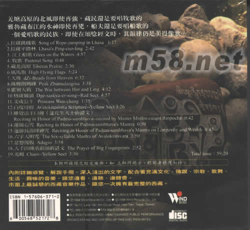 西藏音樂文化入門(m58.net) 羌塘高原的北風(fēng)即使再強,藏民還是要唱牧歌的,雅魯藏布江的水神即使再兇,船夫還是要唱船歌的,一個愛唱歌的民族,即使在頌?zāi)罱?jīng)文時,其韻律仍是美得像歌…… 內(nèi)附詳細(xì)導(dǎo)覽,解說手冊,深入淺出的文字,配合著充滿文化、傳說、宗教、歌舞、生活……興味的音樂,讓你邊看、邊聽、邊體會。 市面上最誠懇的西藏音樂作品,讓您一次擁有最完整的西藏。
