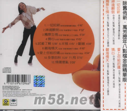 01. 一切如新(美商如新電視廣告歌曲) 02. 神魂顛倒(中視八點檔"孽海花"片尾曲) 03. 觸景生情(中視八點檔"戲王之王"主題曲) 04. 猜心(中視八點檔"再世情緣"片尾曲) 05. 試著了解 06. 半袖 07. 斷線 08. 碧海情天(臺視八點檔"碧海情天"主題曲) 09. 愛上你給的痛(臺視八點檔"唐太宗李世民"片尾曲) 10. 多事的秋 11. 飛 12. 情傷意亂