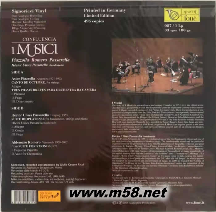 意大利音樂家合奏團[接連 CONFLUENCIA 黑膠(m58.net) 1. 譽滿全球室樂團「意大利音樂家合奏團」自六十週年紀念特輯 「維瓦爾迪:四季」后另一新作。 2. 樸質(zhì)音色錄音系列 (natural sound recording) – 以現(xiàn)場實況收錄,不作后期修改調(diào)教,音色自然。 3. 演奏拉丁裔著名作曲家阿斯特‧皮亞佐拉(Astor Piazzolla), 阿迪馬羅·羅梅羅(Aldemaro Romero)及 赫克托‧烏利塞斯‧帕薩雷拉( Héctor Ulises Passarella)的精彩作品。