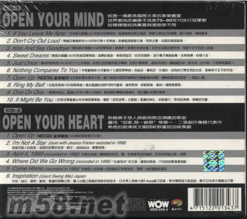 CD 1 OPEN YOUR MIND 01. If You Leave Me Now(芝加哥合唱團(tuán)1967年首支冠軍單曲) 02. Don't Cry Out Loud(瑪麗莎曼徹斯特1978年排行第十名單曲) 03. Kiss And Say Goodbye(曼哈頓合唱團(tuán)1976年冠軍單曲) 04. Sweet Dreams(舞韻合唱團(tuán)1983年英美冠軍單曲) 05. Just Once(詹姆斯殷格朗1981年排行十七名單曲,收錄于昆西瓊斯創(chuàng)作專(zhuān)輯) 06. Nothing Compares To You(辛妮歐康諾90年歐美十七國(guó)冠軍單曲) 07. Open Up(雀巢咖啡全球最新廣告歌英文版) 08. Ring My Bell(安妮塔華德79年冠軍單曲) 09. One On One(霍爾與奧茲二重唱82年排行第七名單曲) 10. It Might Be You(史蒂芬華夏普83年抒情冠軍單曲,電影[窈窕淑男]主題曲) CD 2 OPEN YOUR HEART 01. Open Up(雀巢咖啡全球最新廣告歌中文版) 02. I'm Not A Star(duet with Jessica Folcker recorded in 1998) 03. April 5,1969(recorded in 1998) 04. Where Did We Go Wrong(recorded in 1996) 05. Come Home(recorded in 1996) 06. Inspiration(Giant Swing Mix)Japan