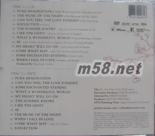 DISK 1 CD 1. 1.PURE IMAGINATION –Willy Wonka And The Chocolate Factory 甜美幻境 (選自「歡樂糖果屋」,1971年第44屆奧斯卡「最佳原創(chuàng)或改編歌曲配樂」提名) 2. 1.THE MUSIC OF THE NIGHT –The Phantom Of The Opera 夜之樂章 (選自「歌劇魅影」,2004年第77屆奧斯卡「最佳原創(chuàng)歌曲」、「最佳藝術(shù)指導(dǎo)」、「最佳攝影」提名) 3. 1.CAN YOU FEEL THE LOVE TONIGHT –The Lion King 今晚你感受到愛了嗎 (選自「獅子王」,榮獲1994年第67屆奧斯卡「最佳原創(chuàng)歌曲」、「最佳原創(chuàng)配樂」大獎(jiǎng)) 4. 1.REFLECTION –Mulan 倒影 (選自「花木蘭」,1998年第71屆奧斯卡「最佳音樂類或喜劇類原創(chuàng)配樂」提名) 5. 1.THE SUMMER KNOWS –Summer of ’42 夏天知我心 (葛萊美入圍傳奇小號手克里斯伯堤伴奏) (選自「往事如煙」,榮獲1971年第44屆奧斯卡「最佳原創(chuàng)配樂」大獎(jiǎng)) 6. 1.I SEE THE LIGHT –Tangled 我看見了光明 (小賈姬與哥哥Jacob動人對唱) (選自「魔髮奇緣」,2010年第83屆奧斯卡「最佳原創(chuàng)歌曲」提名) 7. 1.WHAT A WONDERFUL WORLD –Good Morning, Vietnam 多美好的世界 (選自「早安越南」,1987年第60屆奧斯卡「最佳男主角」提名) 8. 1.SE –Cinema Paradiso 如果 (跨界大提琴雙人組「提琴雙杰」伴奏) (選自「新天堂樂園」,榮獲1989年第62屆奧斯卡「最佳外語片」大獎(jiǎng)) 9. 1.MY HEART WILL GO ON –Titanic 愛無止盡 (葛萊美小提琴名家約夏貝爾伴奏) (選自「鐵達(dá)尼號」,榮獲1997年第70屆奧斯卡「最佳原創(chuàng)歌曲」共十一項(xiàng)大獎(jiǎng)) 10. 1.COME WHAT MAY –Moulin Rouge 無論如何 (與加拿大美聲男高音合唱) (選自「紅磨坊」,榮獲2001年第74屆奧斯卡「最佳藝術(shù)指導(dǎo)」、「最佳服裝設(shè)計(jì)」大獎(jiǎng)) 11. 1.SOME ENCHANTED EVENING –South Pacific 某個(gè)醉人的夜晚 (選自「南太平洋」,榮獲1958年第31屆奧斯卡「最佳音效」大獎(jiǎng)) 12. 1.WHEN I FALL IN LOVE –Sleepless In Seattle 當(dāng)我墜入情網(wǎng) (選自「西雅圖夜未眠」,1993年第66屆奧斯卡「最佳原創(chuàng)歌曲」、「最佳原創(chuàng)劇本」提名) DISK 2 DVD 編號 曲名 試聽 1. 美國公視優(yōu)質(zhì)拍攝小賈姬「Music Of The Movies」電視演唱會 PURE IMAGINATION 2. CAN YOU FEEL THE LOVE TONIGHT 3. SOME ENCHANTED EVENING 4. WHAT A WONDERFUL WORLD 5. MY HEART WILL GO ON 6. THE SUMMER KNOWS 7. I SEE THE LIGHT 8. SE 9. THE MUSIC OF THE NIGHT 10. WHEN I FALL IN LOVE 11. COME WHAT MAY – with The Tenors 12. REFLECTION