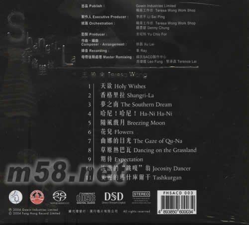 價格為估,以實到貨為準! 香格里拉SACD(m58.net) 胡琴魔女發燒珍藏盤 王曉南堪稱胡琴界最引人驚訝的奇女子,嫵媚無拘的演奏風情,加上火熱精湛的飆奏技巧,既創新又炫目,王曉南成為史上將胡琴帶入流行時尚的第一人。 2002年王曉南「天欲」專輯甫推出便燃起一陣銷售熱潮,尤其專輯的優異音質更引發眾多發燒友的側目討論。這回,SACD版特別聘請香港發燒界名人Leo Fung著手炮制,透過更高規格的后制取樣技術,音樂畫面自是鮮明無比,肯定能讓音響老饕過足癮頭。當然,千萬不要忘了王曉南的音樂,取材自中國西南香格里拉的幻境美景,豐富多元的世界音樂現代觀,絕對是發燒體驗外最大的聽覺享受。