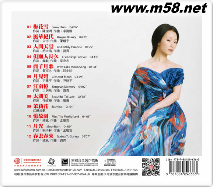 01 梅花雪 Snow Plum 04’06” 作詞:陳潔明 作曲:李海鷹 02 風華絕代 Unique Beauty 04’28” 作詞:朱海 作曲:陳翔宇 03 人間天堂 An Earthly Paradise 04’22” 作詞:趙大鳴 作曲:劉青 04 但愿人長久 Friendship Forever 04’13” 作詞:蘇軾 作曲:梁宏志 05 西子月歌 West Lake Moon Song 04’34” 作詞:賀東久 作曲:彭小紅 06 月兒彎 Crescent Moon 03’29” 作詞:尹建平 作曲:尹建平 07 江南憶 Jiangnan Memory 04’02” 作詞:白居易 作曲:劉青 08 太湖美 Beautiful Tai Lake 02’58” 作詞:任紅舉 作曲:龍飛 09 茉莉花 Jasmine 03’54” 江蘇民歌 10 憶故園 Miss The Motherland 04’01” 作詞:國風 作曲:孟慶云 11 月光 Moonlight 04’09” 作詞:鬍子林 作曲:孟慶云 12 春去春來 Spring To Spring 05’07” 作詞:國風 作曲:劉青