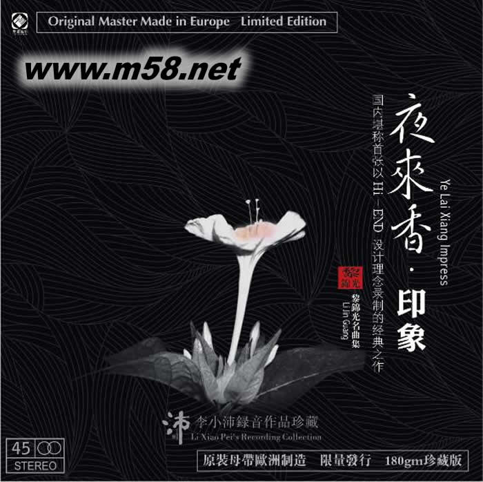 夜來香·印象 黎錦光名曲集 45轉 黑膠(m58.net) 歌曲《夜來香》改編成無伴奏混聲合唱版本,聲部分明,人聲動態清晰飽滿;《哪個不多情》打動人心,演唱者劉琳是黎錦光的外孫女,錄音人聲的定位真實悅耳,體現出錄音大師李小沛的高超水平;《滿場飛》充滿倫巴舞曲的節奏,仿若將人帶回燈紅酒綠的老上海...同時,上世紀30年代戲劇文化開始蓬勃發展,音樂家黎錦光先生也為眾多電影提供歌曲,如為“華影”所拍攝電影《紅樓夢》而作的《葬花》主奏二胡的是民樂大師明源先生,為戰后香港的一部國語電影《燕燕于飛》所作插曲《黃葉舞秋風》,著名老電影《天涯歌女》插曲《襟上一朵花》等作品,將歌曲改編成純器樂曲,不失原作特點的同時畫面感極強;同時富有濃厚鄉土情懷的《采檳榔》、《四季青》等根據民間小調所創作的作品,在編配時也遵循作曲家黎錦光先生的創作風格來演繹。