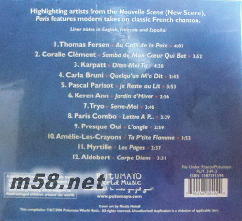 Putumayo Presents: paris 巴黎 美版(m58.net) 十二位新浪漫樂風上最受歡迎的巴黎歌手之經典作品 不論你在開車、在海邊、在咖啡廳、或是在星期天懶洋洋的午后,一本書、一杯茶,與巴黎談戀愛 巴黎,世界四大時尚之都之首,不論是建筑風格、還是人們的時尚品味;不論是塞納河左岸的咖啡香氣、還是流瀉在香榭大道的空氣,都是如此的浪漫難擋。從十九世紀初浪漫至今的香頌、到60、70年代手風琴、搖弦琴及法式風笛當道、再到90年代融合大量北非阿爾及利亞素材的Rai,及傳統歐洲的西班牙Flamenco和吉普賽Gypsy的多元樂風,巴黎的香頌在音樂上面也如流行時尚服飾般,展現出多變與撩人之姿。二十一世紀初,融合了當代奢華風之后,成就了新一波巴黎浪漫主義的代表樂風,我們稱此為「新浪漫主義」(Neuvelle Scene)。 此樂風以傳統香頌為基礎,融合了各個時期多元流行素材,再加上了近期大受歡迎的婆娑娜瓦 (Bossa Nova),「新浪漫」從上世紀末開始橫掃整個西歐地區,如今這股勢力也燒到全世界。此輯完整收錄12位在此樂風上最受歡迎的巴黎歌手之經典作品,包括擁有沙啞慵懶獨門嗓音註冊招牌的首席男歌手Thomas Fersen、以輕爵士浪漫風著稱的女歌手卡拉布妮、有濃厚巴黎香頌色彩的代表團體Paris Combo、以簡單吉他貝斯及打擊樂起家的巴黎清新四人組合Tryo、以首張專輯就征服全法國的超可愛女聲Amelie-Les-Crayons、當然還有三個以獨特法式Bossa Nova揚名的新浪漫歌手Coralie Clement、Pascal Parisot及Myrtille。不論你在開車、在海邊、在咖啡廳、或是在星期天懶洋洋的午后,一本書、一杯茶,與巴黎談戀愛,極盡浪漫奢華享受莫過於此。