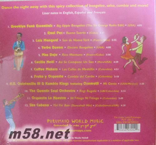 拉丁派對 Latin Party(m58.net) 拉丁美洲最夯、最時(shí)尚、最熱情的跳舞歌大全 紐約夜店的Boogaloo、哥倫比亞的Cumbia,到加勒比海的古巴的Son、牙買加的Reggae/SKA、波多黎各的Salsa 拉丁音樂堪稱世界最熱情有活力的音樂之一,拉丁音樂的曲式都直接與舞蹈及舞步相關(guān),不論是為了歡樂派對所需,或是真的要用來跳舞,亦或是只是單純的用來打造享受休閒渡假的氣氛,拉丁音樂絕對是大家共同的首選。拉丁音樂之所以如此受歡迎,全賴各種熱力十足又富含變化的曲式,源自美國紐約夜店的Boogaloo、哥倫比亞的Cumbia,到加勒比海的古巴的Son、牙買加的Reggae/SKA、多明尼加的Bachata及Merengue、波多黎各的Salsa,甚至到南美巴西的Samba及Bossa Nova,整個(gè)一路串連下來,並向世界幅射延燒,全球完全陷入拉丁音樂的歡樂氣氛之中。 世界音樂大廠Putumayo推廣拉丁美洲音樂一直不遺於力,先后推出了多張的主題選輯,包括蒐羅時(shí)尚電子拉丁新藝人曲式的Nuevo Lation、齊聚諸多當(dāng)今拉丁人氣好手的Radio Latino、拉丁舞會專用的¡Baila!、展現(xiàn)拉丁美洲女聲魅力的Women of Latin America,全都是叫好叫座的暢銷作,此輯Latin Party又是在全球期盼下推出的Party系列新作,收錄了上列讓人瘋狂的拉丁曲式,包括由紐約兩大拉丁樂隊(duì)Brooklyn Funk Essentials及Yerba Buena共獻(xiàn)的兩首當(dāng)前時(shí)尚紐約夜店最夯的Boogaloo舞曲;兩組先后旅居法國的古巴組合Raul Paz及Mas Bajo帶來兩首不同風(fēng)味的Son/Cha Cha Cha歌曲;由兩個(gè)波多黎各組合Luis Mangual及Cecilia Noël演出的標(biāo)準(zhǔn)Salsa曲風(fēng),也讓人熱到無法喘息;另哥倫比亞團(tuán)體Coffee Makers大膽採用了牙買加的SKA;另一支哥倫比亞團(tuán)體Fruko y Orquesta則展現(xiàn)出最有當(dāng)?shù)靥厣腃umbia樂風(fēng),這些拼湊起來,就是一幅熱情難擋的拉丁派對。
