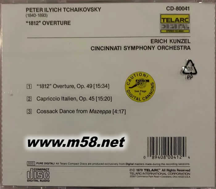 柴可夫斯基:1812序曲TCHAIKOVSKY:1812(m58.net) 指揮:ERICH KUNZEL 18l2年是俄國遭受拿破侖大軍的入侵,民族危亡的關頭。老柴這首音樂會序曲以粗獷而明快的敘事筆調,逐次表現了戰爭的激烈、俄方將士的英勇以及戰壕中士兵們的思鄉之情。這場戰爭以法軍從莫斯科的潰敗而告終,于是樂曲的結尾響起歡慶勝利的鐘聲和禮炮聲,一度囂張的《馬賽曲》讓位于沙俄國歌。