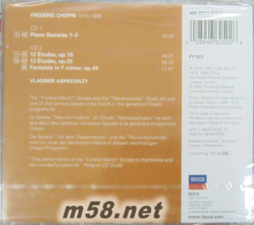 蕭邦:鋼琴奏鳴曲&24首練習(xí)曲Chopin:Piano Sonatas 1-3&24 Etudes(m58.net) 本集收錄的兩套蕭邦曲目中,包括了十分著名的「葬禮進(jìn)行曲」(包含於第2號鋼琴奏鳴曲中),以及「革命」與「黑鍵」練習(xí)曲。這些作品在鋼琴大師阿胥肯納吉的十指下,呈現(xiàn)無與倫比的浪漫琴韻。留聲機雜誌認(rèn)為:「阿胥肯納吉的蕭邦無須多費脣舌…第3號奏鳴曲無疑地非常優(yōu)異…『葬禮進(jìn)行曲』令人念念不忘…」。而企鵝唱片評鑑針對這份《練習(xí)曲》錄音指出:對某些鑑賞家而言此為首選之版本。2000, 1月出版