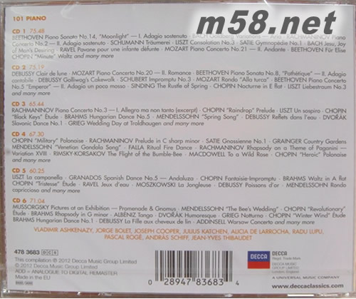101 Piano 101鋼琴殿堂大師精選套裝 101古典系列6CD套裝 德版(m58.net) 2012全新101最愛系列 古典名廠牌DECCA超值6CD必備曲目,殿堂大師演繹 DECCA唱片官方試聽網(wǎng)址(片段): http://www.deccaclassics.com/cat/single?sort=newest_rec&PRODUCT_NR=4783683&SearchString=101&per_page=50&flow_per_page=50&presentation=flow&UNBUYABLE=1