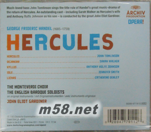 Disc: 1 1. Act I: 1. Ov - The English Baroque Soloists/John Eliot Gardiner 2. Act I: 2. 'See With What Sad Dejection': Recitativo Accompagnato - Catherine Denley 3. Act I: 3. 'No Longer, Fate, Relentless Frown': Aria - Catherine Denley 4. Act I: 4. 'O Hercules! Why Art Thou Absent From Me?': Recitativo Accompagnato/5. 'The World, When... - Sarah Walker 5. Act I: 6. 'Princess! Be Comforted, And Hope The Best': Recitativo - Catherine Denley/Sarah Walker/Anthony Rolfe Johnson 6. Act I: 7. 'I Feel, I Feel The God': Aria - Anthony Rolfe Johnson 7. Act I: 8. 'Then I Am Lost! O Dreadful Oracle!': Recitativo/9. 'There In... - Sarah Walker 8. Act I: 10. 'Despair Not! But Let Rising Hope Suspend': Recitativo/11. 'Where... - Anthony Rolfe Johnson 9. Act I: 12. 'O Filial Piety! O Generous Love!': Chor - The Nonteverdi Chor 10. Act I: 13. 'Banish Your Fears! The Noble Hercules': Recitativo/14. 'Begone, My Fears, Fly... - Catherine Denley/Sarah Walker 11. Act I: 15. 'A Train Of Captives, Red With Honest Wounds': Recitativo - Catherine Denley/Anthony Rolfe Johnson/Sarah Walker 12. Act I: 16. March - The English Baroque Soloists/John Eliot Gardiner 13. Act I: 17. 'Thanks To The Powers Above': Recitativo - John Tomlinson/Jennifer Smith 14. Act I: 18. 'My Father! Ah! Methinks I See': Aria - Jennifer Smith 15. Act I: 19. 'Now Farewell, Arms! From Hence The Tide Of Time': Recitativo/20. 'The... - John Tomlinson 16. Act I: 21. 'Cross With Festal Pomp The Day': Chor - The Monteverdi Chor 17. Act II: 22. 'How Blest The Maid Ordained To Dwell': Aria - Jennifer Smith 18. Act II: 23. 'It Must Be So! Fame Speaks Aloud My Wrongs': Aria/24. 'When Beauty Sorrow's... - Sarah Walker/Jennifer Smith 19. Act II: 25. 'Whence This Unjust Suspicion?': Recitativo - Jennifer Smith/Sarah Walker 20. Act II: 26. 'Ah! Think What Ills The Jealous Prove': Aria - Jennifer Smith 21. Act II: 27. 'It Is Too Sure That Hercules Is False': Recitativo - Sarah Walker/Catherine Denley 22. Act II: 28. 'Jealousy! Infernal Pest': Chor - The Monteverdi Chor Disc: 2 1. Act II: 29. 'She Knows My Passion, And Has Heard Me Breathe': Recitativo - Anthony Rolfe Johnson/Jennifer Smith 2. Act II: 30. 'From Celestial Seats Descending': Aria - Anthony Rolfe Johnson 3. Act II: 31. 'Wanton God Of Amorous Fires': Chor - The Monteverdi Chor 4. Act II: 32. 'Yes, I Congratulate Your Titles, Swelled': Recitativo/33. 'Alcides' Name... - Sarah Walker/John Tomlinson 5. Act II: 34. 'O Glorious Pattern Of Heroic Deeds!': Recitativo - Sarah Walker 6. Act II: 36. 'You Are Deceived! Some Villain Has Belied': Recitativo - John Tomlinson/Sarah Walker 7. Act II: 37. 'Cease, Ruler Of The Day, To Rise': Aria - Sarah Walker 8. Act II: 38. 'Some Kinder Power Inspire Me To Regain': Recitativo - Sarah Walker/Catherine Denley/Jennifer Smith 9. Act II: 39. 'Joys Of Freedom, Joys Of Power': Duet - Sarah Walker/Jennifer Smith 10. Act II: 40. 'Father Of Hercules, Great Jove, O Help': Recitativo/41. 'Love And Hymen, Hand In... - Sarah Walker/The Monteverdi Chor 11. Act III: 42. Sinf - The English Baroque Soloists/John Eliot Gardiner 12. Act III: 43. 'Ye Sons Of Trachin, Mourn Your Valiant Chief': Recitativo - Catherine Denley 13. Act III: 44. 'O Scene Of Unexampled Woe': Aria - Catherine Denley 14. Act III: 45. 'Tyrants Now No More Shall Dread': Chor - The Monteverdi Chor 15. Act III: 46. 'O Jove! What Land Is This, What Clime Accurst': Recitativo Accompagnato - John Tomlinson 16. Act III: 47. 'Great Jove! Relieve His Pains!': Recitativo - Anthony Rolfe Johnson/John Tomlinson 17. Act III: 48. 'Let Not Fame The Tidings Spread': Aria - Anthony Rolfe Johnson 18. Act III: 49. 'Where Shall I Fly? Where Hide This Guilty Head?': Recitativo Accompagnato - Sarah Walker 19. Act III: 50. 'Lo! The Fair Fatal Cause Of All This Ruin!': Recitativo - Sarah Walker/Jennifer Smith 20. Act III: 51. 'My Breast With Tender Pity Swells': Aria - Jennifer Smith 21. Act III: 52. 'Princess, Rejoice! Whose Heaven-Directed Hand': Recitativo - Peter Savidge/Sarah Walker 22. Act III: 53. 'Words Are Too Faint To Speak The Warring Passions': Recitativo - Sarah Walker/Peter Savidge/Anthony Rolfe Johnson/Jennifer Smith 23. Act III: 54. 'O Prince, Whose Virtues All Admire'/'O Princess, Whose Exalted Charms': Duet - Jennifer Smith/Anthony Rolfe Johnson 24. Act III: 55. 'Ye Sons Of Freedom, Now, In Every Clime': Recitativo/56. 'To Him Your Grateful... - Peter Savidge/The Monteverdi Chor