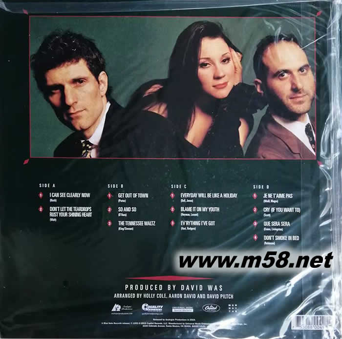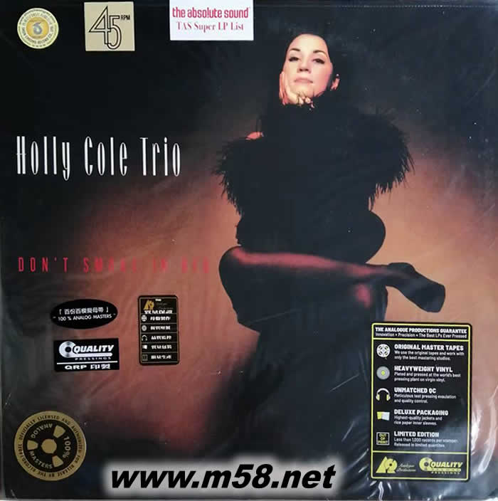 DON'T SMOKE IN BED 床上禁煙 45轉 黑膠 限量版(m58.net) Holly Cole這姑娘的聲音真是特別,可以高吭,可以深情,可以爵士,可以搖滾。這姑娘的合作伙伴,器樂演奏家都超一流。錄音室的空間與器材也超好。唱片的主體是Holly Cole的嗓音與鋼琴、Bass,這三樣都錄得非常好,讓人一聽就喜歡 這張唱片錄制時間是1993年,錄音地點是加拿大多倫多的Reaction Studios,是貨真價實的類比錄音,不是從數位母帶轉制。母帶處理特別請洛杉磯的Bernie Grundman處理,數位母帶也是Bernie Grundman處理,品質可以放心。