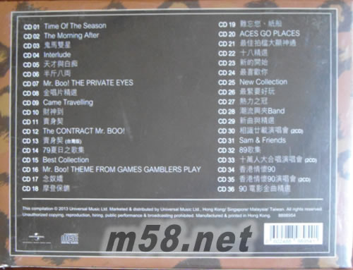 曲目: 專輯1: [Time Of The Season] 01. Time of The Season 02. Till I met You 03. A Carnation For Rebu 04. Carolina In My Mind 05. Love is Just a Game 06. She's Headed For the Country 07. Medley: I Just Can't Help Believing/ You've Got Your Troubles I've Got Mine 08. Yesterday, When I was Young 09. Reason To Believe 10. Truly Julie's Blues 11. It's Gonna Change 12. New World In The Morning 專輯2: [Morning After] 01. The Morning After 02. Was A Sunny Day 03. Lost Horizon 04. Cycles 05. Roll Over 06. Stay Awhile 07. I Got A Name 08. Travelling Boy 09. If You Could Read My Mind 10. What Have They Done To My Song Ma 11. Last Thing On My Mind 12. Skyline Pigeon 專輯3: [鬼馬雙星] 01. 雙星情歌 02. 鬼馬雙星 03. 甜蜜伴侶 04. 無情夜冷風 05. 一水隔天涯/ 愛你三百六十年 06. 春夢良宵 07. 制水歌 08. 等玉人 09. 鐵塔凌云 10. 夜雨聲 11. 雙星情歌音樂 專輯4: [Interlude] 01. Theme from Jeremy 02. Please Mr. Postman 03. Let's live for today 04. I'll paint you a song 05. Danny's Song 06. Take me for what I'm worth 07. Save your heart for me 08. Interlude 09. Lucy in the sky with diamonds 10. April Lady 11. Keep Searchin' 12. Come Tomorrow 13. It's only Love 14. Take me Home, Country Roads 專輯5: [天才與白癡] 01. 天才與白癡 02. 天才白癡往日情 03. 天才白癡錢錢錢 04. 天才白癡夢 05. 情人離別去 06. 青春夢里人 07. 獨上西樓 08. 齊齊唱首歌 09. 莫等待 10. 歡樂桃源 11. 故苑懷舊 12. 天才白癡往日情[音樂] 專輯6: [The Private Eyes 半斤八両] 01. 半斤八両 02. 浪子心聲 03. 打雀英雄傳 04. 梨渦淺笑 05. 大家跟住唱 06. 有酒今朝醉 07. 知音夢里尋 08. 鬼馬大家樂-香港交通歌/醫生頌/點解要擺酒/拍拖安全歌 09. 夜半輕私語 10. 斷腸夢 11. 追求三部曲 12. 流水恨 專輯7: [ミスター・ブー/ Mr. BOO!」/ サミュエル・ホイ] 01. THEME FROM“THE PRIVATE EYES 02. THE DRIFTER'S SONG 03. THE MAH JONG SONG 04. THE DIMPLED SMILE 05. SING ALONG 06. BOTTOMS UP 07. WHERE IS MY LOVE? 08. "LET'S ROCK"MEDLEY: TRIBUTE TO THE LOCAL TRAFFIC/ DOCTOR’S THEME/ WHY DOES HAVING PARTIES/ SAFETY IN COURTSHIP 09. MIDNIGHT WHISPERS 10. THE BROKEN DREAM 11. TO COURT A GIRL 12. THE RIVER'S SONG 專輯8: [復黑王 許冠杰-金唱片精選] 01. 半斤八両 02. 浪子心聲 03. 雙星情歌 04. 鬼馬雙星 05. 鐵塔凌云 06. 天才與白癡 07. 天才白癡往日情 08. 天才白癡夢 09. The Morning After 10. Theme from Jeremy 11. Streets Of London 12. Time of The Season 13. Interlude 14. Stay Awhile 15. Lost Horizon 專輯9: [Came Travelling] 01. A Spaceman Came Travelling 02. Start All Over Again 03. Sunflower 04. I Saw The Light 05. Baby Dont Get Hooked On Me 06. The Lady Is Waiting 07. Things We Said Today 08. Me And The Elephant 09. Rivers Are For Boats 10. Don't You Care 11. Every Face Tells A Story 12. Faithless Love 13. Hotel California 專輯10: [財神到] 01. 財神到 02. 何處覓蓬萊 03. 錢會繼續嚟 04. 為你 05. 蔴雀耍樂 06. 柔情淚 07. 我愛你 08. 佛跳墻 09. 往事 10. 今宵 11. 咪當我老襯 12. 愛 專輯11: [賣身契] 01. 賣身契 02. 舞伴 03. 男兒漢 04. 世事如棋 05. 應該要自愛 06. 人生的道路 07. 學生哥 08. 杯酒當歌 09. 拜拜 10. 相思萬千重 11. 飲勝 12. 父母恩 13. 太空舞 專輯12: [Mr. Boo!/インベーダー作戦] 01. Mr. Boo!/インベーダー作戦」主題曲 02. ダンシィング・パートナー 03. スタンディング・トール 04. 人生はチェス・ゲーム 05. ラヴ・ユアセルフ 06. 人生の旅路 07. 學生たちヘ 08. 気楽な人生 09. バイ・バイ 10. ハートブレイク・ミラージュ 11. ドリンク・アップ 12. 父母の恩 13. スペース・ダンス 14. ミスタ一・ブ一/ Mr. BOO!」主題曲 專輯13: [賣身契 電影主題曲] 01. 優美的旋律 (許冠英) 02. 昔日情懷 (許冠杰) 03. 何必尋夢 (許冠杰) 04. 發錢寒 (許冠英) 05. Sunflower (許冠杰) 06. Faithless Love (許冠杰) 07. A Spaceman Came Travelling (許冠杰) 08. I Saw The Light (許冠杰) 09. Things We Said Today (許冠杰) 10. Interlude (許冠杰) 11. Theme From Jeremy (許冠杰) 12. Rivers Are For Boats (許冠杰) 專輯14: ['79夏日之情歌] 01. 十個女仔 02. 那里是吾家 03. 一生中幾許歡笑 04. 春夢 05. 知心友 06. 加價熱潮 07. 何日再相逢 08. 忍 09. 腐朽化神奇 10. 催眠曲 11. 說一聲再見 專輯15: [サミュエル・ホイ”ヒット曲集] 01. 「ミスタ一・ブ一/ Mr. BOO!」主題曲 02. ドリスター・ソンゲ 03. 干杯ソンダ 04. ステイ・アホワイル 05. 戀のミーズン 06. モーニング・アフター 07. 「Mr. BOO!/ギャンズル大將」主題曲 08. 「Mr. BOO!/ギャンズル大將」 愛のテーマ 09. 「Mr. Boo!/インベーダー作戦」主題曲 10. 気楽な人生 11. 學生たちヘ 12. ミャイン你令我閃耀 專輯16: [Mr. BOO! THEME FROM GAMES GAMBLERS PLAY] 01. GAMES GAMBLERS PLAY 02. LOVELY YEARS 03. HOW MUCH HAPPINESS IN MY LIFE 04. SPRING DREAMS 05. COLD COLD WIND 06. KISS YOU ALL OVER 07. LOVE THEME FROM " GAMES GAMBLERS PLAY 08. RAISE AROUND THE CLOCK 09. WONDERFUL WORLD 10. RYTHM OF THE RAIN 11. MAGIC 12. LULLABY 專輯17: [念奴嬌] 01. 尖沙咀Susie 02. 夜夜念奴嬌 03. 搵嘢做 04. 這一曲送給您 05. 好景自己去尋 06. 夕陽 07. 先敬羅衣后敬人 08. 始終被愁困 09. 發噏風 10. 每事問 11. 傀儡 12. 再會,香港! 專輯18: [摩登保鑣] 01. 摩登保鑣 02. 印象 03. 扮嘢 04. 笑嚇就算 05. 長春不老 06. 我的心仍屬于您 07. 恭喜!恭喜! 08. 人辦 09. 陽光 10. 甜蜜的往事 11. 歌曲解困憂 12. 我問 專輯19: [難忘您‧紙船] 01. 難忘您 02. 最佳拍檔 03. 我像一片云 04. 十全十美 05. 快樂 06. 迷途的小羔羊 07. 紙船 08. 是您那一吻 09. 愛像黃昏 10. 昨天 11. 知恥近乎勇 專輯20: [ACES GO PLACES 惡漢探偵] 01. REMEMBER YOU 02