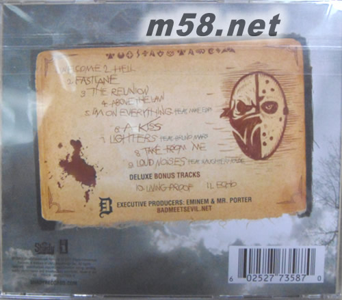 1 Welcome 2 Hell - 2:57 2 Fastlane - 4:09 3 The Reunion - 4:50 4 Above the Law - 3:29 5 I'm On Everything - 4:31 6 A Kiss - 4:34 7 Lighters - 5:03 8 Take From Me - 3:25 9 Loud Noises - 4:21 10 Living Proof [*] - 3:55 11 Echo [*] - 4:55 bad meets evil這個組合有兩位底特律的mc組成,一個是Royce Da 5'9",還有一名mc,就是著名的白人hip hop歌手eminem