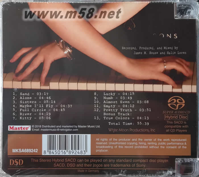 觸動情感 HALIE LOREN FULL CIRCLE SACD(劉漢盛推介)(m58.net) 全新SACD版本特別收錄經(jīng)典名曲“True Colors” 音響論壇主編劉漢盛先生的 “100張棒喝CD”推薦,美國得獎爵士女歌手海莉蘿倫(Halie Loren)好評如潮經(jīng)典暢銷專輯,13首鋼琴與女聲交織的溫暖樂曲,現(xiàn)推出全新SACD版本。海莉以感性的嗓音獻唱“Sisters”,一字一句觸動人心,專輯同名歌曲 “Full Circle”,以激盪人心的情話感染樂迷,重新演繹Joni Mitchell名作 “River”,以清新的旋律帶來溫暖人心的語句。特別收錄Bonus Track “True Colors”,重新演繹經(jīng)典名曲,令人回味。原裝母帶Remaster,並以SACD印製,靚絕的人聲更覺情感濃烈。