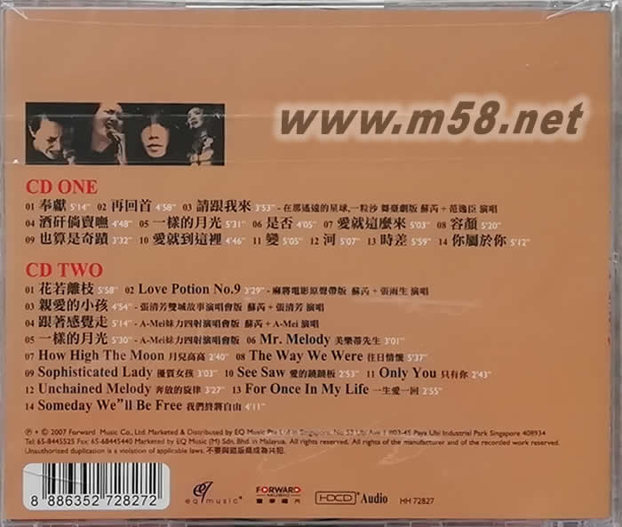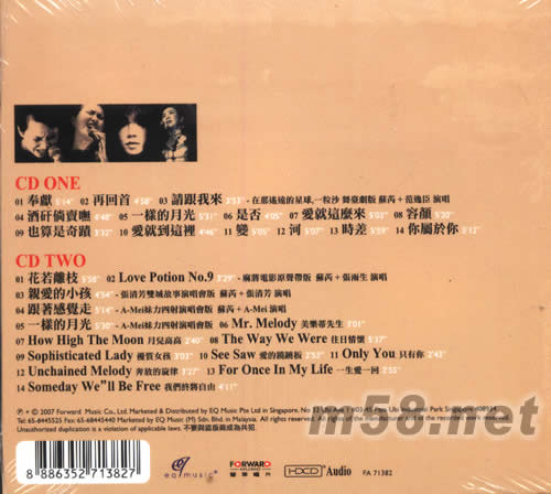 CD ONE 01. 奉獻 02. 再回首 03. 請跟我來 -在那遙遠的星球,一粒沙 舞臺劇版 蘇芮+范逸臣演唱 04. 酒矸倘賣無 05. 一樣的月光 06. 是否 07. 愛就這么來 08. 容顏 09. 也算是奇跡 10. 愛就到這里 11. 變 12. 河 13. 時差 14. 你屬于你 CD TWO 01. 花若離枝 02. LOVE POTION NO.9 -麻將電影原聲帶版 蘇芮+張雨生 演唱 03. 親愛的小孩 -張清芳雙城故事演唱會版 蘇芮+張清芳 演唱 04. 跟著感覺走 -A-MEI妹力四射演唱會版 蘇芮+A-MEI 演唱 05. 一樣的月光 -A-MEI妹力四射演唱會版 06. MR.MELODY 美樂蒂先生 07. How High The Moon 月兒高高 08. The Way We Were 往日情懷 09. Sophisticated Lady 優質女孩 10. See Saw 愛的蹺蹺板 11. Only You 只有你 12. Unchained Melody 奔放的旋律 13. For Once In My Life 一生愛一回 14. Someday We'll Be Free 我們終將自由
