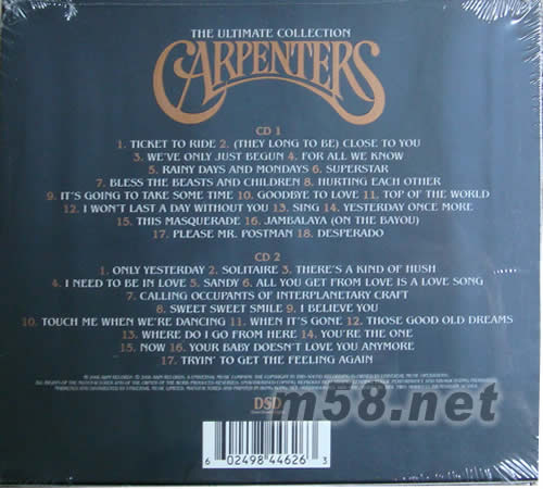 CD1 01.Ticket To Ride 遠行的車票 02.(They Long To Be) Close To You 靠近你 03.We've Only Just Begun 我們才剛開始 04.For All We Know 我們如此了解 05.Rainy Days And Mondays 雨天和星期一 06.Superstar 超級巨星 07.Bless The Beasts And Children 祝愿動物和孩子們 08.Hurting Each Other 彼此傷害 09.It's Going To Take Some Time 多給我一點時間 10.Goodbye To Love 告別愛情 11.Top Of The World世界之頂 13.Sing 歡唱 14.Yesterday Once More 昨日重現( 15.This Masquerade 化妝舞會 16.Jambalaya (On Th* ***ou)海鮮雞肉飯(在河上) 17.Please Mr. Postman 請等一下 郵差先生 18.Desperado 亡命之徒 CD2 01.Only Yesterday 只有昨日 02.Solitaire 單人紙牌 03.There's A Kind Of Hush 一片寧靜 04.I Need To Be In Love 我需要戀愛 05.Sandy 珊蒂 06.All You Get From Love Is A Love Song 你從愛中得到的只是一首情歌 07.Calling Occupants Of Interplanetary Craft召集太陽系外星人 08.Sweet Sweet Smile 甜蜜的笑容 09.I Believe You 我相信你 10.Touch Me When We're Dancing 擁我入舞 11.When It's Gone 離我而去 12.Those Good Old Dreams 往日的美夢 13.Where Do I Go From Here 我往哪里去 14.You're The One 你是唯一 15.Now 現在 16.Your Baby Doesn't Love You Anymore 你的情人不再愛你 17.Tryin' To Get The Feeling Again 尋找愛的感覺