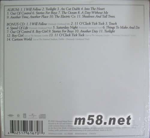 1. I Will Follow 2. Twilight 3. An Cat Dubh 4. Into The Heart 5. Out Of Control 6. Stories For Boys 7. The Ocean 8. A Day Without Me 9. Another Time Another Place 10. The Electric Co. 11. Shadows And Tall Tress Bonus Disc: 1. I Will Follow - Previously Unreleased Mix 2. 11 O'Clock Tick Tock 3. Touch 4. Speed Of Life - Previously Unreleased Track 5. Saturday Night - Previously Unreleased Track 6. Things To Make And Do 7. Out Of Control - Single Version 8. Boy/Girl 9. Stories For Boys - Single Version 10. Another Day 11. Twilight - Single Version 12. Boy/Girl - Live at The Marquee, London 13. 11 O'Clock Tick Tock - Live At The Marquee, London - Previously Unreleased 14. Cartoon World - Live at THe National Stadium, Dublin - Previously Unreleased
