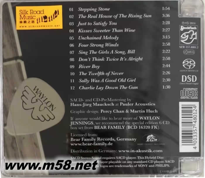 模擬的魅力 黑珍珠 系列第一輯 Analog Pearls Vol.1 SACD 搖滾鄉村音樂(m58.net) Jennings(韋倫·詹寧斯),1937年出生,美國鄉村歌手和音樂家。 但如果您有看過鄉村搖滾大師Johnny Cash 的傳記電影「為妳鐘情」(Walk the line)就會發現他與Johnny Cash是共同演出的好友。1970年代,他與傳奇鄉村歌手Willie Nelson共同推出的專輯,不但是暢銷金榜常客,更獲得許多鄉村音樂大獎。早年從擔任電臺DJ發跡,接著在樂團演奏Bass,后來自己組成The Waylors(也就是專輯解說冊封底的照片)自彈自唱,最后引領了充滿反叛精神的「亡命之徒鄉村音樂」(Outlaw country)運動,生涯中不但獲得許多鄉村音樂大獎,更兩度榮獲葛萊美獎的鄉村音樂演唱獎,創作與演唱功力自是不在話下。 不過這張專輯的封面根本嗅不到一絲「反叛」的氣息,因為這個錄音是偉倫.珍尼斯被當時的唱片大廠RCA相中,納為旗下主力偶像歌手時所錄製的母帶,而這張專輯的主角其實也不是偉倫.珍尼斯,而是傳奇的RCA鋁帶麥克風44與KU-3a。1964年,偉倫.珍尼斯與他的樂團The Waylors在美國亞利桑納州鳳凰城Audio Recorders 的大型錄音室中,在製作人 Herb Alpert的統籌下,錄音師Floyd Ramsey利用RCA 44與KU-3a麥克風,採用全類比的方式錄下這些珍貴的母帶,經過德國老虎魚的精心后製,轉錄成目前最高規格的DSD格式,壓製成SACD,保留類比的原汁原味。除了收錄經典藍調歌曲「The Real House Of The Rising Sun」之外,也選了偉倫.珍尼斯的經典作「Just To Satisfy You」,充滿濃情蜜意的「Kisses Sweeter Than Wine」與「Unchained Melody」,民謠經典「Four Strong Winds」 ,巴布迪倫的「Don't Think Twice It's Alright」,在偉倫.珍尼斯的演繹下,傳達出深情無比的濃郁情感。經典名曲真空管錄音如絲綢般的綿密質感,讓歌手嗓音活靈活現,這是屬於那個時代才有的濃濃類比味!