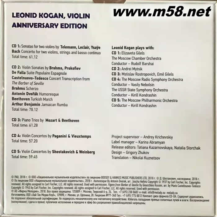 Anniversary Edition 科崗小提琴 藝術(shù) 5CD套裝(m58.net) [曲目] CD1: 泰勒曼/ 萊克爾/ 易沙意: 奏鳴曲; 巴赫: 雙小提琴協(xié)奏曲; 法雅: 西班牙組曲 CD2: 布拉姆斯/ 普羅高菲夫: 奏鳴曲; <塞爾維亞理髮師>協(xié)奏曲; <土耳其進(jìn)行曲>, 詼諧曲… CD3: 莫札特/ 貝多芬: 鋼琴三重奏 CD4: 帕格尼尼/維奧當(dāng): 小提琴協(xié)奏曲 CD5: 肖斯塔高維奇/ 魏因伯格: 小提琴協(xié)奏曲