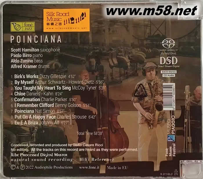 鳳仙花 Poinciana SACD(m58.net) Scott Hamilton (薩克斯管) Paolo Birro (鋼琴) Aldo Zunino (低音大提琴) Alfred Kramer (鼓) 1. 四位飲譽國際的爵士樂大師包括薩克斯管手史考特‧漢彌頓(Scott Hamilton)、鋼琴手保羅‧比亞羅(Paolo Birro) 、低音大提琴手阿爾杜‧楚尼諾(Aldo Zunino)及鼓手艾弗‧克藍瑪(Alfred Kramer)所組成的爵士樂四重奏再次被邀於2021年在意大利蓬泰德拉(Pontedera)「比亞喬奧博物館」(Museo Piaggio)大禮堂,由意大利殿堂級錄音師里玆(Giulio Cesare Ricci)所創立的「豐力」唱片公司(fonè)所舉辦的"「豐力」音樂節(fonè Music Festival)"中演出,整個過程實況被錄製成專輯『鳳仙花(Poinciana)』出版,精彩無比的演奏,全被收錄在其中。