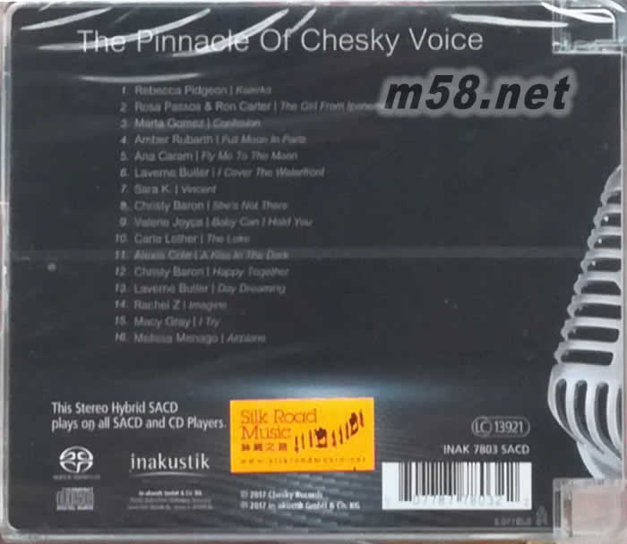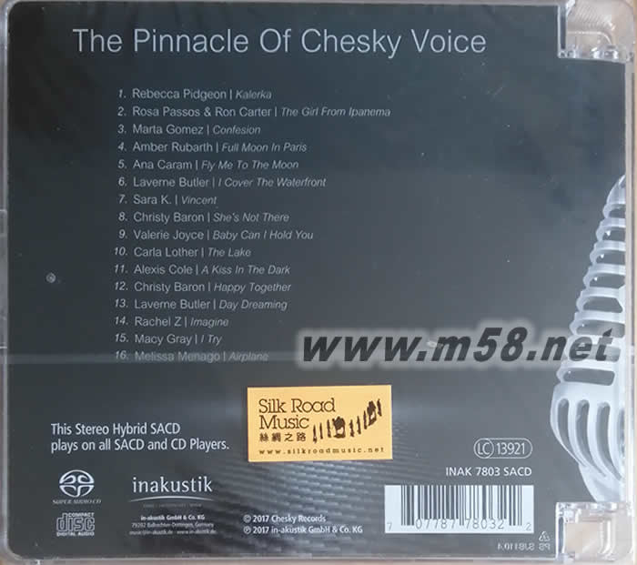 hesky非凡女聲 (The Pinnacle Of Chesky Voice) SACD版(m58.net) 1. 繼2014年出版《"金耳朵"聽力測試立體聲盤第3輯 ("Die Hortest"-Edition Vol. III)》獲得空前成后,兩大發燒界巨擘in-akustik及Chesky再度攜手泡製另一以各具特色的女聲歌唱為主題的專輯。 2. 精挑Chesky公司旗下最具代表性的女歌星的永恆經典名曲包括《安娜•卡拉瑪: 帶我飛向月球 (Ana Caram: Fly Me To The Moon)、《羅莎•芭蘇絲及羅恩•卡特: 來自伊帕內瑪的女孩(Rosa Passos & Ron Carter - The Girl From Ipanema)》、《克莉絲蒂•貝倫: 歡聚一起(Christy Baron: Happy Together)》及《她不在那裹(She's Not There)》、《韋柏卡•庇芝: 卡勒嘉(Rebecca Pidgeon: Kalerka)》、《安貝•魯巴芙: 月滿在巴黎(Amber Rubarth: Full Moon In Paris)》及《拉文•巴特勒: 白日夢(Laverne Bulter: Day Dreaming)》等,示范級的演繹。 3. SACD母盤由「老虎魚」著名工程師漢斯-約爾格•莫斯克斯(Hans-Joerg Maucksch) 負責操刀,音效出類拔萃,鑑賞與鑑聽必備之選質素更具保証。 4. 此專輯去年曾以180克、45轉2LP為載體出版,獲得追求卓越音效的樂迷好評如潮,現以SACD為載體出版,音色更為清晰明亮,音場深廣寛宏,定位更為明確和具形像化,加上此版本多附錄兩首名曲,更添聆聽樂趣。