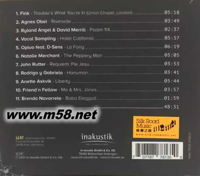 德國(guó)原音 ELAC意力 聲音的體驗(yàn) KLANG LEBT THE VOICE OF ELAC UHQCD(m58.net) 德國(guó)原音+德國(guó)音箱名牌ELAC(意力) 聯(lián)手塑造出一張主題明確、音效突出的鑑聽必然之選 完全德國(guó)製造 Made In Germany 以專門製作高質(zhì)素音箱見稱的”ELAC(意力)”於1926年在德國(guó)的基爾(Kiel)成立,有接近90年的長(zhǎng)久歷史,是一間勇於創(chuàng)新,走進(jìn)時(shí)代尖端的音響器材設(shè)計(jì)和製造公司。公司成立時(shí)是以開發(fā)和拓展聲納技術(shù)(sonar technology)為主,但在1945年二次世界大戰(zhàn)后因市場(chǎng)的需要轉(zhuǎn)移生產(chǎn)縫紉車和收音機(jī),是公司製造的產(chǎn)品首次與音頻(audio)有關(guān)。1948年研發(fā)出首臺(tái)黑膠唱盤PW1在推出市場(chǎng)后迅即成為唱盤中的翹楚,亦奠定了ELAC在音響界崇高地位。1980年代前期開始,公司開拓和生產(chǎn)高級(jí)「發(fā)燒」器材,而揚(yáng)聲器是其中一個(gè)主要的發(fā)展項(xiàng)目,因其產(chǎn)品的性能表現(xiàn)卓越,很快成為追求至美音效的「發(fā)燒友」所心儀的器材之一。在過(guò)往的十多二十年,ELAC的產(chǎn)品不斷地創(chuàng)新和改進(jìn),緊貼市場(chǎng)的需求和改變,亦曾獲得多個(gè)重要的國(guó)際音響有關(guān)的獎(jiǎng)項(xiàng),因此成為音響界中的一個(gè)極具威望的廠牌。因揚(yáng)聲器在整個(gè)音響系統(tǒng)當(dāng)著重要角色,鑑定音準(zhǔn)和真實(shí)重播必定要經(jīng)由它發(fā)揮最高性能表現(xiàn)才能達(dá)致最理想的音響效果。”ELAC(意力)”揚(yáng)聲器的特性是音色晶瑩剔透,動(dòng)力十足,獨(dú)特中充滿魅力,重播真確性極高,這些優(yōu)質(zhì)的表現(xiàn),必須由清澈明亮、解像度高的優(yōu)秀錄音才可將極級(jí)器材的性能完美地呈現(xiàn)。現(xiàn)由以專業(yè)製作及代理高質(zhì)錄音音效產(chǎn)品而獲發(fā)燒樂(lè)迷一致推崇的著名德國(guó)品牌in-akustik為配合宣傳和推廣這德國(guó)出類拔萃的揚(yáng)聲器,精心挑選了14首由旗下最高質(zhì)、最具代表性的歌星演繹旋律極為動(dòng)聽的經(jīng)典名曲,加上每首歌曲的錄音效果皆令人完全信服,著意地以這些廣獲好評(píng)的錄音凸顯這名牌揚(yáng)聲器優(yōu)越過(guò)人的特質(zhì),塑造出一張主題明確、音效突出的鑑聽必然之選。,這些歌曲包括: 以專門製作高質(zhì)素音箱見稱的”ELAC(意力)”於1926年在德國(guó)的基爾(Kiel)成立,有接近90年的長(zhǎng)久歷史,是一間勇於創(chuàng)新,走進(jìn)時(shí)代尖端的音響器材設(shè)計(jì)和製造公司。公司成立時(shí)是以開發(fā)和拓展聲納技術(shù)(sonar technology)為主,但在1945年二次世界大戰(zhàn)后因市場(chǎng)的需要轉(zhuǎn)移生產(chǎn)縫紉車和收音機(jī),是公司製造的產(chǎn)品首次與音頻(audio)有關(guān)。1948年研發(fā)出首臺(tái)黑膠唱盤PW1在推出市場(chǎng)后迅即成為唱盤中的翹楚,亦奠定了ELAC在音響界崇高地位。1980年代前期開始,公司開拓和生產(chǎn)高級(jí)「發(fā)燒」器材,而揚(yáng)聲器是其中一個(gè)主要的發(fā)展項(xiàng)目,因其產(chǎn)品的性能表現(xiàn)卓越,很快成為追求至美音效的「發(fā)燒友」所心儀的器材之一。在過(guò)往的十多二十年,ELAC的產(chǎn)品不斷地創(chuàng)新和改進(jìn),緊貼市場(chǎng)的需求和改變,亦曾獲得多個(gè)重要的國(guó)際音響有關(guān)的獎(jiǎng)項(xiàng),因此成為音響界中的一個(gè)極具威望的廠牌。因揚(yáng)聲器在整個(gè)音響系統(tǒng)當(dāng)著重要角色,鑑定音準(zhǔn)和真實(shí)重播必定要經(jīng)由它發(fā)揮最高性能表現(xiàn)才能達(dá)致最理想的音響效果。”ELAC(意力)”揚(yáng)聲器的特性是音色晶瑩剔透,動(dòng)力十足,獨(dú)特中充滿魅力,重播真確性極高,這些優(yōu)質(zhì)的表現(xiàn),必須由清澈明亮、解像度高的優(yōu)秀錄音才可將極級(jí)器材的性能完美地呈現(xiàn)。現(xiàn)由以專業(yè)製作及代理高質(zhì)錄音音效產(chǎn)品而獲發(fā)燒樂(lè)迷一致推崇的著名德國(guó)品牌in-akustik為配合宣傳和推廣這德國(guó)出類拔萃的揚(yáng)聲器,精心挑選了14首由旗下最高質(zhì)、最具代表性的歌星演繹旋律極為動(dòng)聽的經(jīng)典名曲,加上每首歌曲的錄音效果皆令人完全信服,著意地以這些廣獲好評(píng)的錄音凸顯這名牌揚(yáng)聲器優(yōu)越過(guò)人的特質(zhì),塑造出一張主題明確、音效突出的鑑聽必然之選。