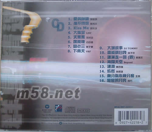 1、愛的呼喚/郭富城 2、舍不得你/鄭秀文 3、KISS ME/梁詠琪 4、大懶堂/LMF 5、天黑黑/孫燕姿 6、跳飛機/古巨基 7、關老三/黃子華 8、下雨天/VRF 9、大城故事/DJ TOMMY 10、誰能明白我/林子祥 11、瀟灑走一回/葉倩文 12、海闊天空/BEYOND 13、漣猗/陳百強 14、依然/林憶蓮 15、幾分傷心幾分癡/王杰 16、彎彎的月亮/呂方