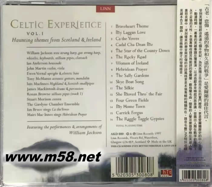 極佳的空間感與漂亮的音樂質感:吶喊!愛爾蘭 CELTIC EXPERIENCE(m58.net) 古老、悲傷、遙遠的事物和久遠的戰爭」是愛爾蘭的最佳寫照,受到英國壓迫性統治七個半世紀之久,為民族獨立自由而反抗的奮斗歷程成為愛爾蘭歷史的中心主軸,漫長的動蕩,一幕幕英雄事蹟反覆的上演,以流血犧牲喚起民族意識,充分展露了人類在戰爭摧殘下永不妥協的天性。看過電影《英雄本色》人,都一定能感受到愛爾蘭人民獨特的民族性,那種堅忍卓絕的不拔毅力,實在令人動容。專輯中的第一首就是大家最為熟悉的電影「英雄本色」主題音樂,可說是史上最優秀的電影配樂之一,曲子中所營造的壯闊場景與戲劇張力令人心胸澎湃不已。而他們的個性也反映在音樂中,不僅刻畫民族的剛毅性情,其音樂還道盡愛爾蘭的景致風光,陰霾的天空,四面八方擁來的海潮聲,以及海上溫柔寧靜的星夜。 這張《吶喊!愛爾蘭》不僅收錄的電影《英雄本色》的主題曲,著名的蘇格蘭樂手威廉杰克森更為此作品演奏許多當地特有的民族樂器,他個人還是個豎琴的演奏高手,本專輯中許多豎琴獨奏就是他的演出。而唯一的歌唱演出部份則是由愛爾蘭著名的民謠演唱者印安布魯斯及瑪莉愿斯跨刀演出,兩人的嗓音真純潔凈,在加上演出自己民族風格的曲目,唱來更是格外動人,且入木三分。並將許多我們耳熟能詳的克爾特旋律編入樂曲中,再加上兩位著名的愛爾蘭民謠歌手充滿敘事效果及戲劇張力的演唱,更為此增添豐富的故事性。值得一提的,本片是由著名音響發燒廠Linn操盤錄音,極佳的空間感與漂亮的音樂質感,所呈現的音效絕對發燒,這從第一首就可以明顯的感受到那股驚天地泣鬼神的傳真音質,更增添了本片所帶來的聆聽樂趣。透過簡單的人聲與樂器,傳達出一首首對戰爭英雄的崇敬與感懷,也深深刻劃出戰爭背后的哀淒與悲慟。若是《鐵達尼號》的克爾特音樂風讓你感到心曠神怡,那么《吶喊!愛爾蘭》必定能讓你聽過之后,低迴不已。 古老的愛爾蘭傳說中,一位失去雙臂的風笛手,因為戰爭讓他無法再為祖國演奏光榮的樂器-風笛。最后,在敵軍的城堡里鬱鬱而終。爾后,寬廣的高原、海岸邊,淒淒的風笛聲常隨風揚起,山谷中彷彿迴響著一段堅定不移的英勇戰事。愛爾蘭的音樂,已逐漸在世界上展露光芒,而威廉杰克森,這位國際知名的多元化製作人,正有系統的將他自己的故鄉愛爾蘭音樂,以一種雅俗共賞的方式,對著全世界歌唱。在劇力萬均的「吶喊!愛爾蘭」推出后,威廉杰克森在傳統的克爾特音樂中,讓弦樂與風笛創造出十足的空間感,且為這張新作「古堡之魂」,做出更豐富的旋律,讓聆樂者深刻體驗到置身於愛爾蘭的遼闊景致。這張新作「古堡之魂」,從豎琴的溫婉優雅,到人聲吟唱的淒美飄渺,以及風笛所帶來的壯闊蕭瑟景象,再加上克爾特最美的聲音麥克‧肯娜的歌聲,使得這一張新作品在氣勢磅礡以及凜冽的悲情之外,還兼帶來了一股來自悠遠北方的清香