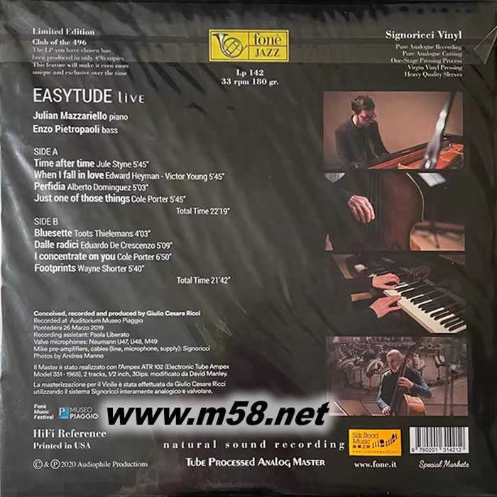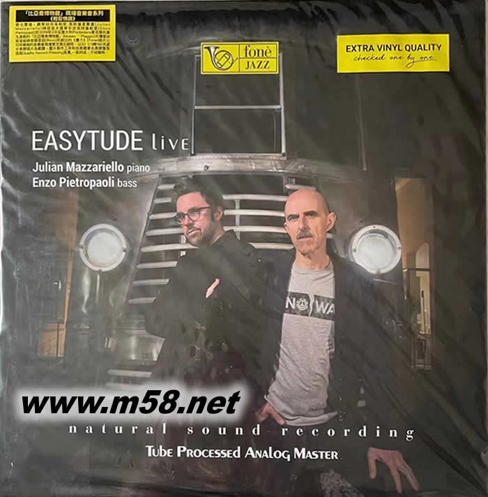 價格為估,以實到貨為準! 「比亞喬博物館」現場音樂會系列 - 輕松情調Live At Museo Piaggio - EASYTUDE Live (鋼琴與大提琴) 黑膠(m58.net) Julian Mazzariello (鋼琴) Enzo Pietropaoli (低音大提琴) 馬斯薩里爾羅鋼琴/皮埃特羅帕里低音大提琴SACD,鋼琴演奏行云流水,低音提琴色彩繽紛,演奏現場全情投入,里茲錄音! 1. 1978年出生於英國的意大利裔爵士樂鋼琴手朱利安.馬斯薩里爾盧(Julian Mazzariello)七歲開始習琴時已對「即興演奏」極感興趣。十七歲移居意大利后活躍於當地爵士樂壇,以彈奏流暢優雅,和聲精致見稱,特別是即興時的彈奏和其他樂手的互動,更是精彩萬分。 2. 恩佐.皮埃特羅帕里(Enzo Pietropaoli)出生於熱拿亞(Geona)而成長於羅馬(Rome),是現今意大利著名古典音樂和爵士樂低音大提琴手。在四十年的職業生涯,他到過歐洲、北美和南美、亞洲和非洲作巡迴演出,亦曾與多位著名爵士樂手合作,嫻熟優秀的琴技為他在爵士樂壇帶來不少榮譽,備受讚賞。 3. 馬斯薩里爾盧和皮埃特羅帕里兩人於2019年3月26日在意大利蓬泰德拉(Pontedera)「比亞喬奧博物館」(Museo Piaggio)大禮堂由意大利殿堂級錄音師里玆(Giulio Cesare Ricci)所創立的【豐力】唱片公司(fonè)所舉辦的音樂會使出渾身解數,落力表演,整個過程,精彩絕倫。 4. 「比亞喬奧(Piaggio)」是意大利著名摩托車生產商,其博物館內的大禮堂音響設計、設備和效果都非常出色,極為適合音樂會的演出和錄音用途。作為專業錄音師的里茲挑選這禮堂作為他旗下的歌星、樂手和樂隊的演出場地,一定是切合他對音響效果嚴格的要求。 5. 整個音樂會的演出盡顯馬斯薩里爾盧的彈奏緩慢時如小河淌水,急速時如潮拍海岸,琴音清脆明亮。皮埃特羅帕里的低音大提琴的拉奏動態十足,色彩繽紛的琴音如泣如訴地伴隨,兩位樂手全情投入,使出渾身解數,淋漓盡致地演繹九首精彩樂曲,加上里茲採用精巧的器材,負責由錄音至母盤製造整個製作過程,配合以SACD為載體,自然真實的空間感,晶瑩剔透的樂器音質,使人越聽越有味道。