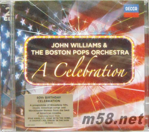 A CELEBRATION歡慶-約翰威廉士80歲生日慶賀專輯A CELEBRATION(古典愛好者必備)(m58.net) 錄:星際大戰、E.T. 外星人、超人、法柜奇兵、火戰車、亂世佳人、粉紅豹、雨中歡唱、紐約,紐約、貓、月光小夜曲、歌舞線上 等名曲 Star Wars, E.T., Superman, Raiders of the Lost Arc, etc. 約翰.威廉士 指揮 波士頓通俗管弦樂團 JOHN WILLIAMS & THE BOSTON POPS ORCHESTRA 這份合輯,是為了慶祝電影配樂家約翰威廉士八十歲生日,而集結他過去親自指揮波士頓通俗管弦樂團的錄音精選而成。這長達兩個半小時的精選輯中,第一張主要是收集約翰威廉士早年的電影配樂作品,包括「超人」、「外星人」、「第三類接觸」、「法柜奇兵」等片中的經典配樂。第二片則是收錄他指揮演奏過去經典電影配樂和舞臺劇中的主題,包括「紐約,紐約」、「貓」、「飛燕金槍」、「金粉世界」、「歌舞線上」等舞臺劇中的名曲。 約翰威廉士出生於一九三二年,在他六十年的電影配樂生涯中,幾乎獨佔了近三十年來所有暢銷電影的主題配樂工作。尤其是他和大導演史提芬史匹柏合作的配樂,幾乎每部都是膾炙人口,叫好又叫座。史匹柏的電影都獨衷由威廉士擔任配樂,所有的電影作品只有兩部不是由威廉士配樂。 威廉士的配樂作品先后曾獲得五座奧斯卡金像獎、二十一座葛萊美獎,四十七次的奧斯卡提名,其提名次數之高,史上只有華德迪士尼超越他。他在一九八零到一九九三年間擔任波士頓通俗管弦樂團的首席指揮,卸任后也被聘為該團終生桂冠指揮,與該團合作關係密切。該團創於一八八五年,至今(2012年)已有一百二十七年的悠久歷史。這是由波士頓交響樂團團員組成的演奏團體,早年由亞瑟費德勒帶領,非常的受到喜愛。