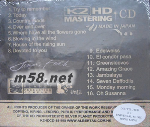 Simple Folk 民歌味道 1 (K2HD)首批限量版(m58.net) Simple Folk 民歌味道 區瑞強 Albert Au K2HD CD Mastering *發燒界男聲首席代表 區瑞強全新力作 *日本頂尖母帶處理(Mastering)袴田剛史Hakamata Takeshi主理 *珍藏首批限量版蓋印限量編號 *「民歌味道 I」經典人聲天碟幕后原班人馬 史上最動聽民歌 殿堂人聲 細膩極品發燒版