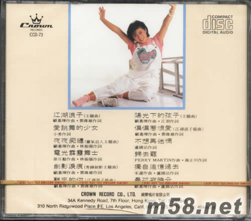 1、江湖浪子(主題曲) 2、愛跳舞的少女 3、夜夜癡纏(靈氣迫人的主題曲) 4、電光霹靂舞士 5、劍影淚淚(青風劍影的主題曲) 6、難忘你你(江湖浪子插曲) 7、陽光下的孩子(主題曲) 8、偏偏惹恨愛(江湖浪子插曲) 9、不想再迷惘 10、歸去罷 11、獨自追憶過去 12、最孤寂時分