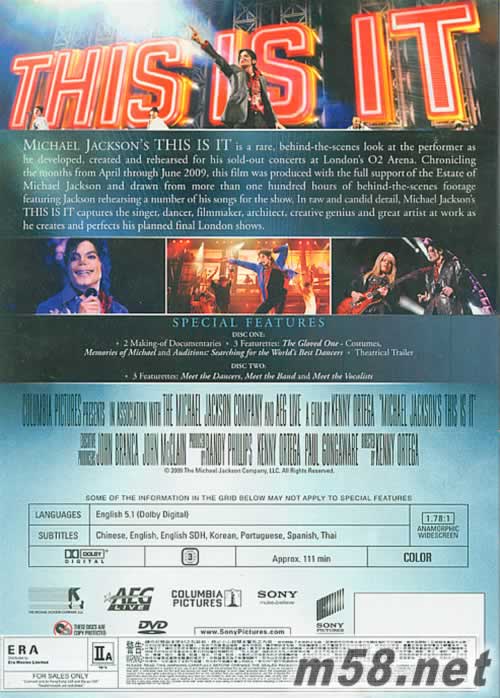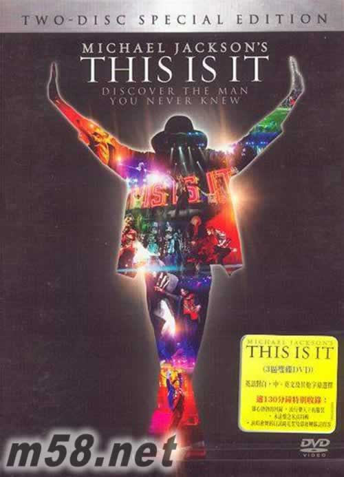 THIS IS IT 2DVD 香港版(m58.net) 雙碟DVD 英語對白 中英文及其他字幕選擇 逾130分鐘特別收錄: 雄心勃勃的回歸 流行樂天王的服裝 永遠懷念米高特輯 演唱會舞蹈員試鏡花絮及幕后團隊訪問等