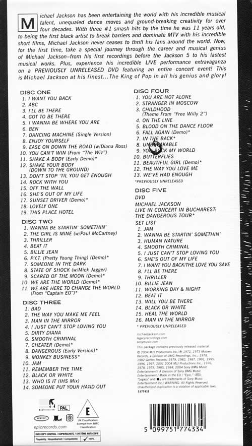 DISC ONE 01. I WANT YOU BACK 02. ABC 03. I'LL BE THERE 04. GOT TO BE THERE 05. I WANNA BE WHERE YOU ARE 06. BEN 07. DANCING MACHINE(Single Version) 08. ENJOY YOURSELF 09. EASE ON DOWN THE ROAD(w/Diana Ross) 10. YOU CAN'T WIN(From"The Wiz") 11. SHAKE A BODY(Early Demo)* 12. SHAKE YOUR BODY(DOWN TO THE GROUND) 13. DON'T STOP TIL YOU GET ENOUGH 14. ROCK WITH YOU 15. OFF THE WALL 16. SHE'S OUT OF MY LIFE 17. SUNSET DRIVER(Demo)* 18. LOVELY ONE 19. THIS PLACE HOTEL DISC TWO 01. WANNA BE STARTIN'SOMETHIN' 02. THE GIRL IS MINE(w/Paul McCartney) 03. THRILLER 04. BEAT IT 05. BILLIE JEAN 06. P.Y.T.(Pretty Young Thing)(Demo)* 07. SOMEONE IN THE DARK 08. STATE OF SHOCK(w/Mick Jagger) 09. SCARED OF THE MOON(Demo)* 10. WE ARE THE WORLD(Demo)* 11. WE ARE HERE TO CHANGE THE WORLD(From"Captain EO")* DISC THREE 01. BAD 02. THE WAY YOU MAKE ME FEEL 03. MAN IN THE MIRROR 04. I JUST CAN'T STOP LOVING YOU 05. DIRTY DIANA 06. SMOOTH CRIMINAL 07. CHEATER(Demo)* 08. DANGEROUS(Early Version)* 09. MONKEY BUSINESS* 10. JAM 11. REMEMBER THE TIME 12. BLACK OR WHITE 13. WHO IS IT(IHS Mix) 14. SOMEONE PUT YOUR HAND OUT DISC FOUR 01. YOU ARE NOT ALONE 02. STRANGER IN MOSCOW 03. CHILDHOOD(Theme From"Free Willy 2") 04. ON THE LINE 05. BLOOD ON THE DANCE FLOOR 06. FALL AGAIN(Demo)* 07. IN THE BACK* 08. UNBREAKABLE 09. YOU ROCK MY WORLD 10. BUTTERFLIES 11. BEAUTIFUL GIRL(Demo)* 12. THE WAY YOU LIVE ME 13. WE'VE HAD ENOUGH *PREVIOUSLY UNRELEASED DISC FIVE DVD MICHAEL JACKSON LIVE IN CONCERT IN BUCHAREST: THE DANGEROUS TOUR* SET LIST 01. JAM 02. WANNA BE STARTIN'SOMETHIN' 03. HUMAN NATURE 04. SMOOTH CRIMINAL 05. I JUST CAN'T STOP LOVING YOU 06. SHE'S OUT OF MY LIFE 07. I WANT YOU BACK/THE LOVE YOU SAVE 08. I'LL BE THERE 09. THRILLER 10. BILLIE JEAN 11. WORKING DAY & NIGHT 12. BEAT IT 13. WILL YOU BE THERE 14. BLACK OR WHITE 15. HEAL THE WORLD 16. MAN IN THE MIRROR *PREVIOUSLY UNRELEASED
