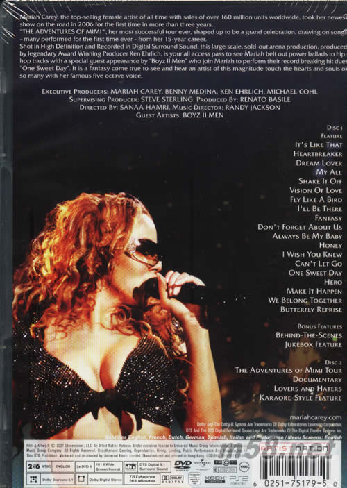 DISC1 1 It's like that 2 Heartbreaker 3 Dream lover 4 My all 5 Shake it of 6 Vision of love 7 Fly like a bird 8 I'll be there 9 Fantasy 10 Don't forget about us 11 Always be my baby 12 Honey 13 I wish you knew 14 Can't let go 15 One sweet day 16 Hero 17 Make it happen 18 We belong together Bonus Features 19 Butterfly reprise 20 Behind-the-scenes (Bonus feature) 21 Jukebox feature Bonus feature) DISC2 22 The adventures of Mimi tour 23 Documentary 24 Lovers and haters 25 Karaoke-style feature