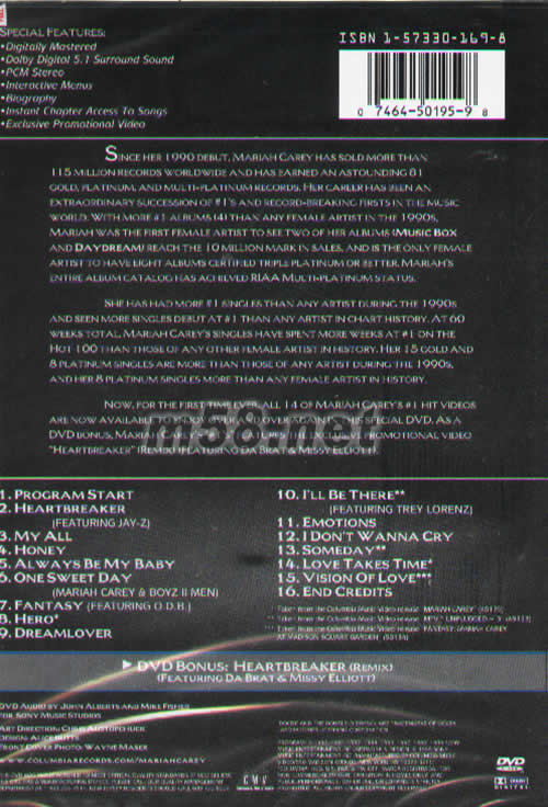 11 EMOTIONS 1991年3周No.1金曲. 12 I DON'T WANNA CRY 13 SOMEDAY 1991年2周No.1金曲. 14 LOVE TAKES TIME 1990年3周No.1金曲. 15 VISION OF LOVE 1990年一鳴驚人的首支單曲,便勇奪排行4周No.1並創下50萬張金唱片銷售記錄,及為Mariah贏得第32屆格萊美“最佳流行樂女藝人”獎座! 16 END CREDITS DVD BONUS HEARTBREAKER(REMIX) (FEATURING DA BRAT & MISSY ELLIOTT)