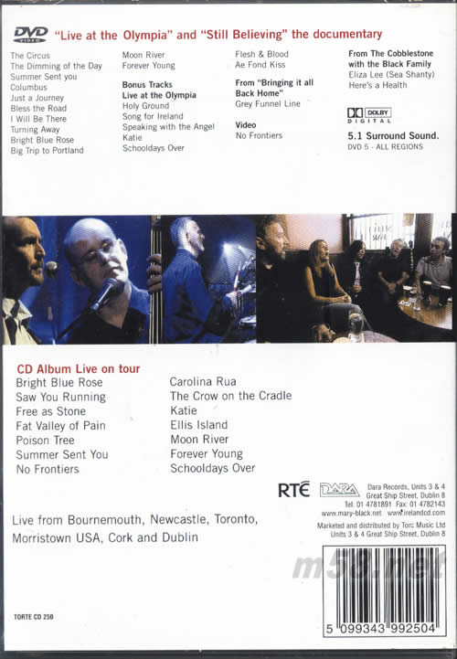 CD 01. Bright Blue Rose 02. Saw You Running 03. Free as Stone 04. Fat Valley of Pain 05. Poison Tree 06. Summer Sent You 07. No Frontiers 08. Carolina Rua 09. The Crow on the Cradle 10. Katie [0:04:27.49] 11. Ellis Island 12. Moon River 13. Forever Young 14. Schooldays Over DVD THE CIRCUS THE DIMMING OF THE DAY SUMMER SENT YOU COLUMBUS JUST A JORNEY BLESS THE ROAD I WILL BE THERE TURNING AWAY BRIGHT BLUE ROSE BIG TRIP TO PORTLAND MOON RIVER FOREVER YOUNG BONUS TRACKS LOVE AT THE OLYMPIA HOLY GROUND SONG FOR LRELAND SPEAKING WITH THE ANGEL KATIE SCHOOLDAYS OVER FLESH & BLOOD AEFOND KISS FROM"BRINGING IT ALL BACK HOME" GREY FUNNEL LINE VIDEO NO FRONTIERS FROM THE COBBLESTONE WITH THE BLACK FAMILY ELIZA LEE(SEA SHANTY) HERE'S A HEALTH