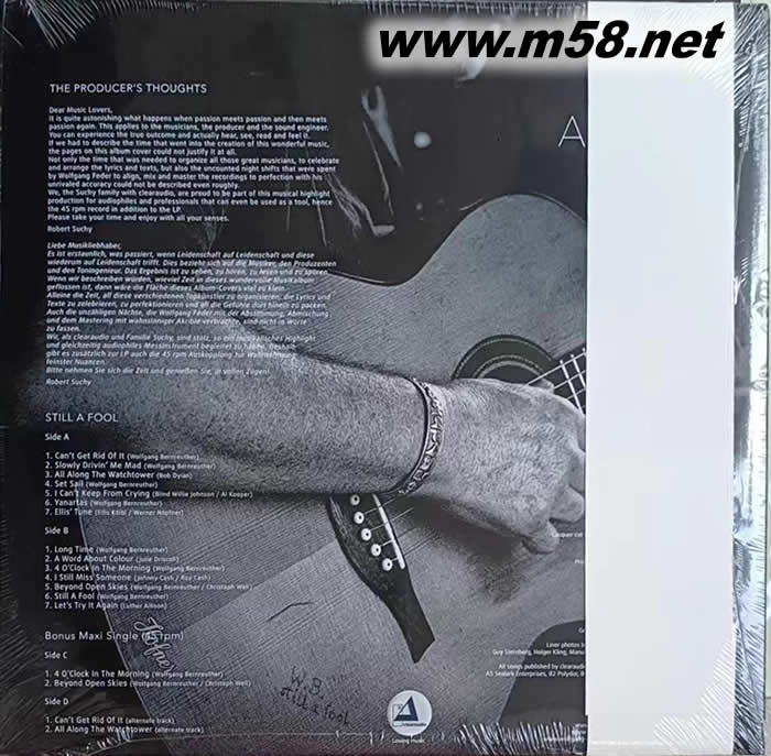 清澈 吉他手 STILL A FOOL 仍是傻瓜 雙黑膠 限量版(m58.net) 德國(guó)名牌發(fā)燒音響clearaudio electronic GmbH 為45週年紀(jì)念特別推出專(zhuān)輯,與clearaudio長(zhǎng)期合作,BLUES結(jié)他手Wolfgang Bernreuther (伯恩羅伊瑟)第六張作品Still A Fool (Super Deluxe Edition)。全球限量超豪華版,首批共1000套,以高品質(zhì)硬紙板折疊封面(Gatefold Jacket)制作,兩張一套黑膠唱片,當(dāng)中包括33 1/3RPM 原始14首歌曲LP 和 45RPM 兩面共4 軌之超大單曲,內(nèi)附一張雙面印刷海報(bào)、一幅克勞斯·沃爾曼 (Klaus Voormann)繪畫(huà)藝術(shù)印刷品,普通版CD,同時(shí)發(fā)行