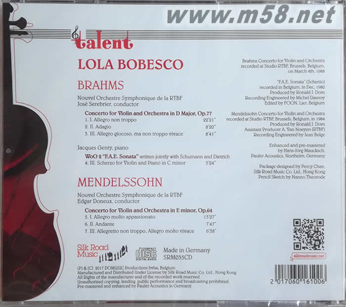 博貝絲庫 VOL.5 布拉姆斯:D大調(diào)小提琴協(xié)奏曲(m58.net) Lola Bobesco (violin)、José Serebrier (conductor)、 Edgar Doneux (conductor)、Nouvel Orchestre Symphonique de la RTBF、Jacques Genty (piano) 1. 被譽為二十世紀(jì)最杰出的小提琴演奏家之一,羅馬尼亞籍之洛菈•博貝絲庫博(Lola Bobesco)以琴音優(yōu)雅,分句精致,富音樂性,臺上魅力更是驚人而馳名於世,但基於多種復(fù)雜旳原因,她留存下來的錄音不多,現(xiàn)存的多數(shù)是極為珍貴,藝術(shù)文化價值甚高的杰出音樂紀(jì)錄。 2.「博貝絲庫系列笫五輯」她採用名琴喬瓦尼.巴蒂斯塔.瓜雅達里尼「1754」(Giovanni Battista Guddagnini「1754」)以出神入化的琴技,成熟圓潤的琴音,帶點奔放的風(fēng)格演繹布拉姆斯的傳世經(jīng)典[D大調(diào)小提琴協(xié)奏曲,作品77( Brahms: Concerto for Violin and Orchestra in D Major, Op. 77),特別是第三樂章的演奏,被專業(yè)樂評推許為最蕩氣迴腸的演繹之一。 3. 此協(xié)奏曲的錄音從未作商業(yè)性出版,專輯亦收錄由博貝絲庫配合其夫婿雅克•姜堤(Jacques Genty)演奏布拉姆斯的[ C小調(diào)給小提琴與鋼琴諧謔曲(Brahms: Scherzo for Violin and Piano in C Minor) ],極為珍貴。 ★ CD盤版本除了收錄由博貝絲庫配合其夫婿雅克•姜堤(Jacques Genty)演奏布拉姆斯的[ C小調(diào)給小提琴與鋼琴諧謔曲(Brahms: Scherzo for Violin and Piano in C Minor) ]外,更添加門德爾松的[E小調(diào)小提琴協(xié)奏曲,作品64(Mendelssohn: Concerto for Violin and Orchestra, E Minor Op. 64)],精彩無比,極為珍貴。